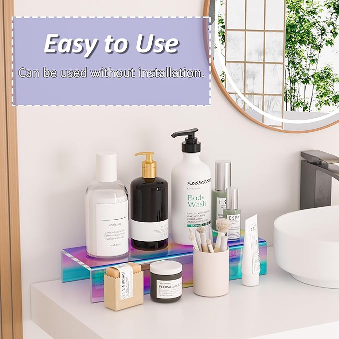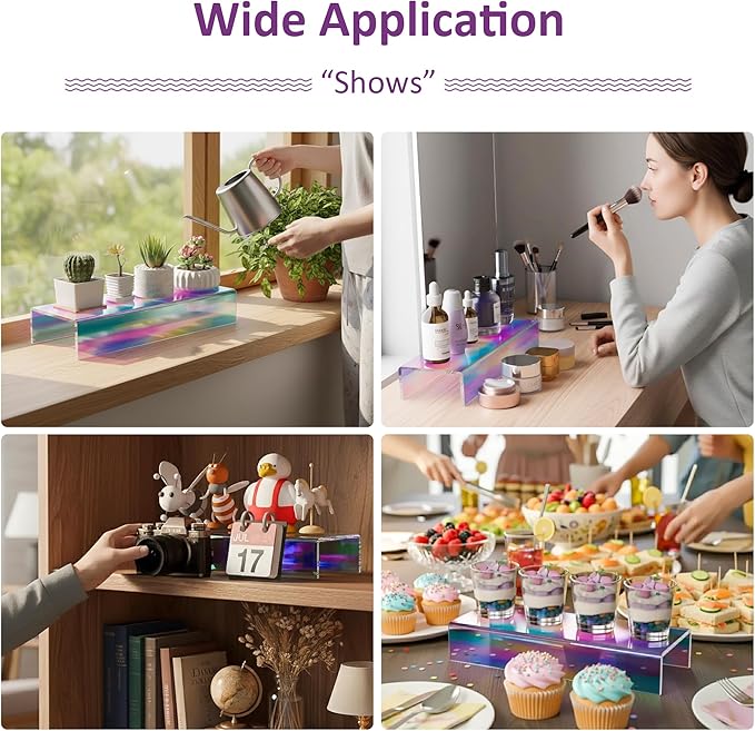 Acrylic Shelf Riser 12x4.3x2 pack of 2, Iridescent Display Shelf 12” for Shoes, Glasses, Plants, Home Decors, Perfume, 12x4.3x2 Inch