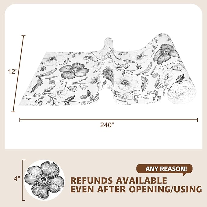 - Large-Size Roll + Value-Added Free Gifts for Easy Installation : Comes in a 12in x 20FT roll (Non slip shelf liner roll Wire shelf liner 12 inch) with a chic black floral print—adding a touch of sophistication to any space while complementing diverse decor styles the roll can be freely cut to match any size requirement additionally it includes free knives and tape measures (Shelf liner with free knife and tape measure Drawer liner with free measuring tape) along with precise cutting tools (Cabinet liner with free cutting tools) no extra purchases are needed making it simple to measure and cut for irregular storage spaces while preserving the integrity of the black floral pattern
