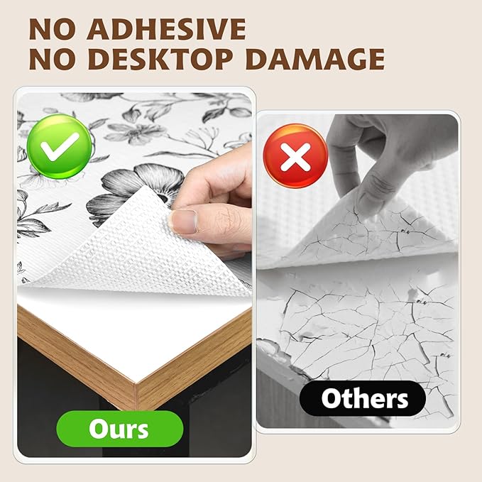 - Non-Adhesive, Non-Slip, Waterproof & Easy to Clean : This Non adhesive shelf liner (Non-adhesive shelf liner) features a stylish black floral pattern and is crafted from premium double-layer PVC the Non slip shelf liner (Non-slip shelf liner) design delivers strong anti-slip performance keeping tableware cosmetics and other items securely in place without sliding enhanced with Waterproof shelf liner and Waterproof cabinet liner properties it effortlessly resists kitchen grease the Non stick shelf liner characteristic allows stains to be wiped clean in a single swipe and it can be reused after washing—maintaining both your home’s cleanliness and the vibrant black floral design