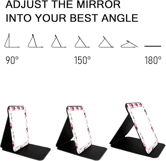 - 🌹【Adjustable stand mirror】: Compact foldable, portable design for easy storage when not in use. Supports 90°-180° angle adjustment and features a stable base that securely stands on any flat surface—desk, vanitie, nightstands, and more—without tipping over.