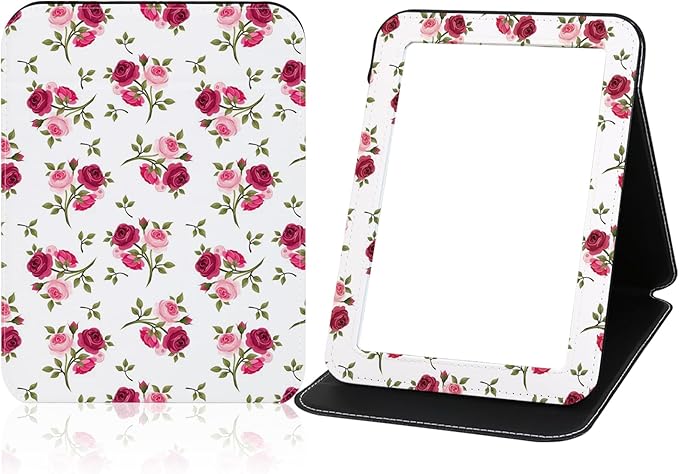 Mirror Folding Portable Travel Makeup Compact Personal Hand Mirror PU Portable Adjustable Rectangular Ultrathin Vanity Mirror with Stand, for Travel, Camping,Home, Office & On-The-Go (Rose Pattern)
