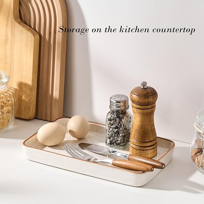 - [Decorative Organizer Tray]-- The tray measures 10"L x 6"W x 1.1"H and is crafted from ceramic material, offering waterproof, stain-resistant, and odor-free properties. Its reactive white color design adds a sophisticated, versatile touch, making it an ideal choice for kitchens and home decor. Choose our tray to enhance the warm, high-quality ambiance of your home!