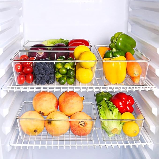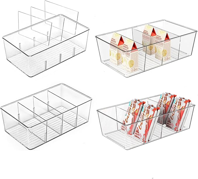 - Make Storage More Simple: These clear plastic storage bins with removable dividers is great for creating a clean and organized refrigerator or pantry. Ideal for use in the kitchen, pantry, fridge, bathroom, cabinet, laundry room organizers and storage, they provide the perfect organization and storage solution for snacks, spices, drinks, toiletries, and daily essentials