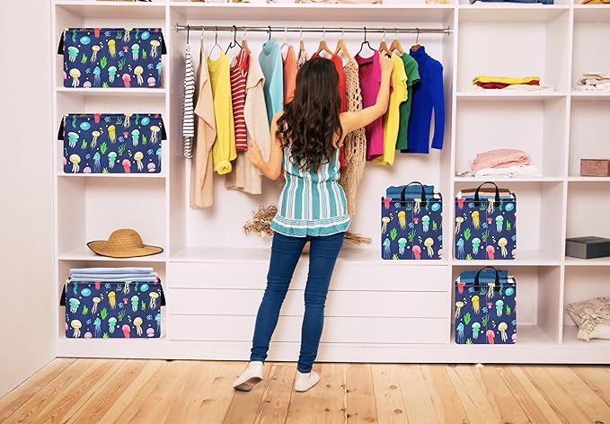 KUNRO Rectang Storage Basket Gift Shelf Basket Storage Bin, Nursery Basket Organizer Box for With Handles for Room Deco (Colorful Jellyfish)