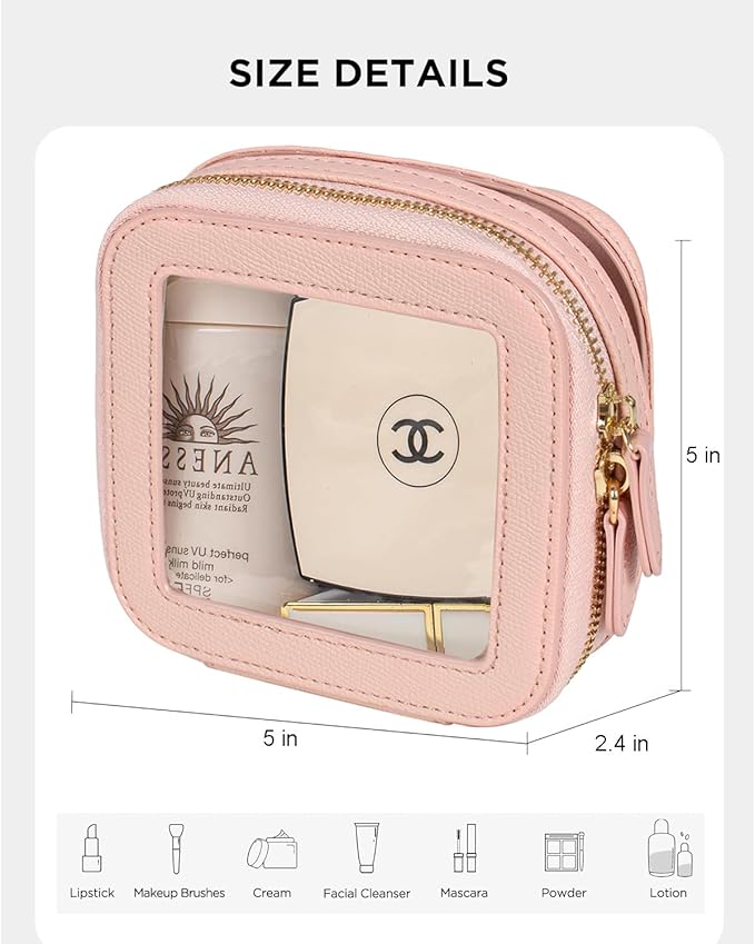 - CLEAR DESIGN: The travel makeup bag See-through design allows quick identification of contents, making it easy to find items without digging through the bag. Small, space-saving dimensions make this pouch ideal for carrying daily essentials while fitting comfortably in purses or carry-on bags. - S: 5 * 4.7 * 2 in