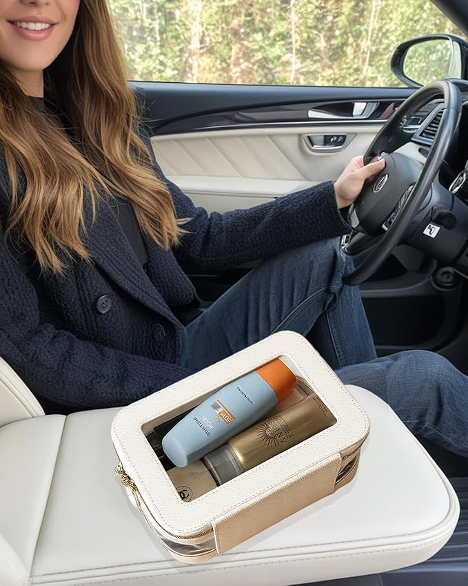 - Car Must Have Essential: Our small travel toiletry bag is roomy to store your makeup brushes, lipstick, eyebrow pencil, make-up foundation, skin care, cables, chargersor and other little items. It make your daily make-up, cream, lipstick, perfume and other beauty things organized and protected. This clear mini toiletry bag can be a good car accessory fits in the center console or other parts of your car