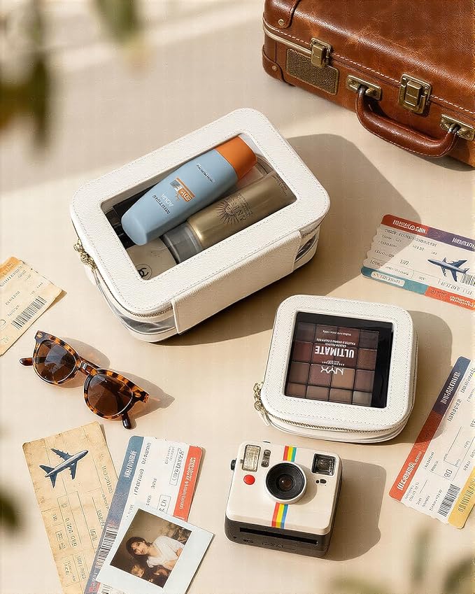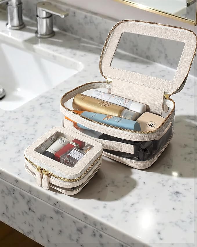 - WATERPROOF & CLEAR VISIBILITY: Made with high-quality PU leather and thick transparent PVC material that strongly secures storage for all your essentials and smooth reinforced double zipper make you can open and close effortlessly. The clear design for easy to find and get what you need, say good bye to the hassle of finding small things in an opaque and mess bag. Only need wiped clean with a damp cloth to keep your travel bags neat and clean