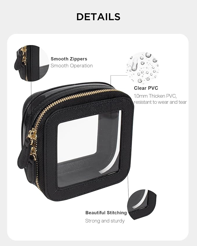 - CLEAR DESIGN: The travel makeup bag See-through design allows quick identification of contents, making it easy to find items without digging through the bag. Small, space-saving dimensions make this pouch ideal for carrying daily essentials while fitting comfortably in purses or carry-on bags. - S: 5 * 4.7 * 2 in