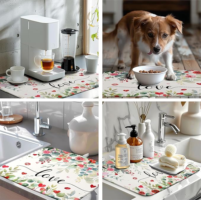 - [Kitchen Accessories]: The surface of the kitchen drying mat is printed with cute love hearts, eucalyptus leaves patterns. Unique design can create a strong Valentine atmosphere for kitchen countertops and home environments; Cute valentine dish mat will surprise your family and friends, making it the perfect holiday gift for them