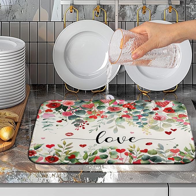- [Kitchen Accessories]: The surface of the kitchen drying mat is printed with cute love hearts, eucalyptus leaves patterns. Unique design can create a strong Valentine atmosphere for kitchen countertops and home environments; Cute valentine dish mat will surprise your family and friends, making it the perfect holiday gift for them