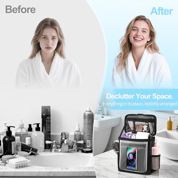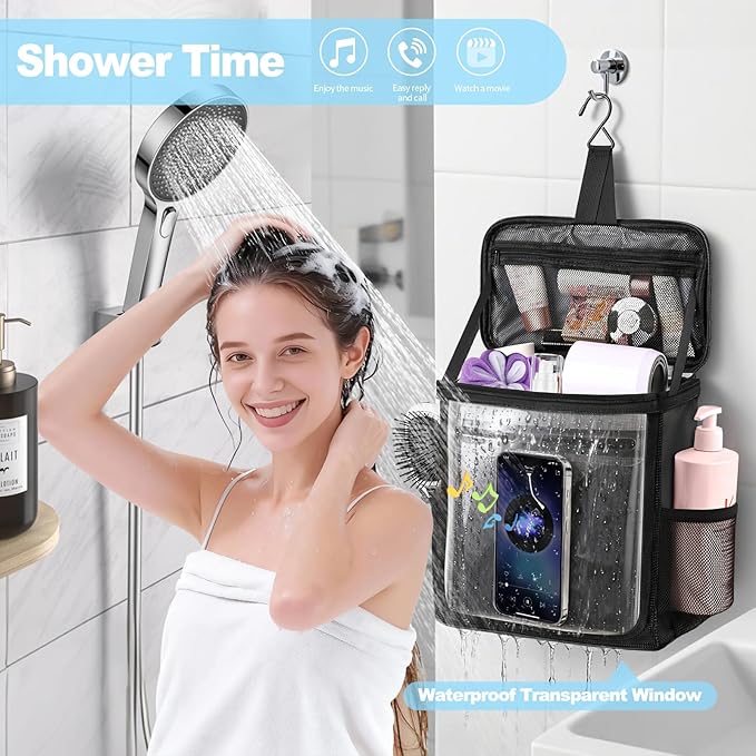 - Multi-Pocket Organization: with 6 functional compartments, this shower caddy keeps your countertop tidy , including a large main pocket, a front waterproof transparent window pocket which is compatible for most phones/small items, four mesh pockets (rear for shoes/towels, two sides and top for versatile storage) to hold everything neatly in place