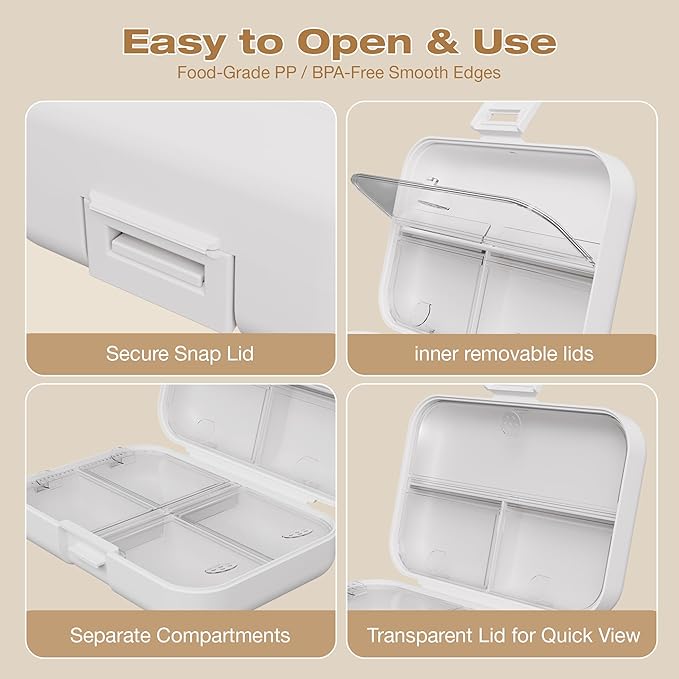 - Secure Snap Closure & Moisture-Resistant Shell: Made of durable, food-grade PP plastic with a tight snap clasp. Keeps pills safe from accidental spills, dust, or dampness, maintaining freshness and potency
